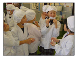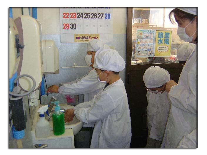 工場では、必ず最初に手洗いです。
